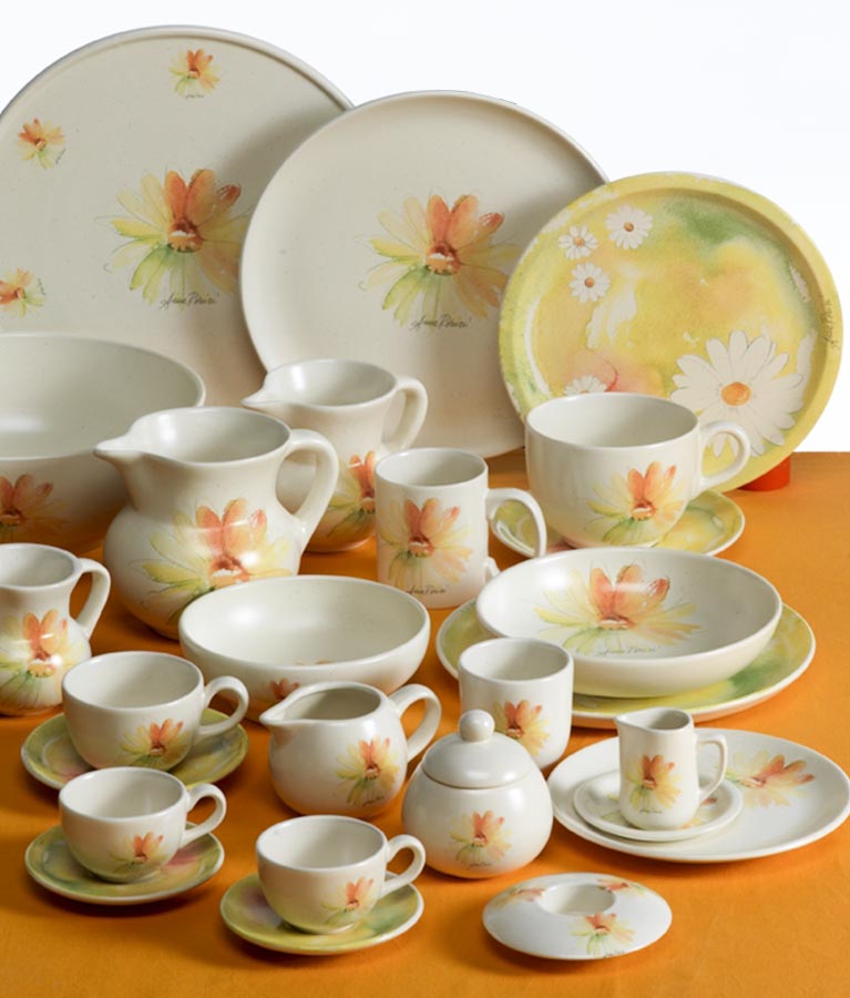 La Collezione è caratterizzata, nel piatto piano da una bella margherita bianca inserita in un sfondo verdino sfumato, mentre nel resto delgli articoli si richiamano i colori del piano nella margherita stilizzata.