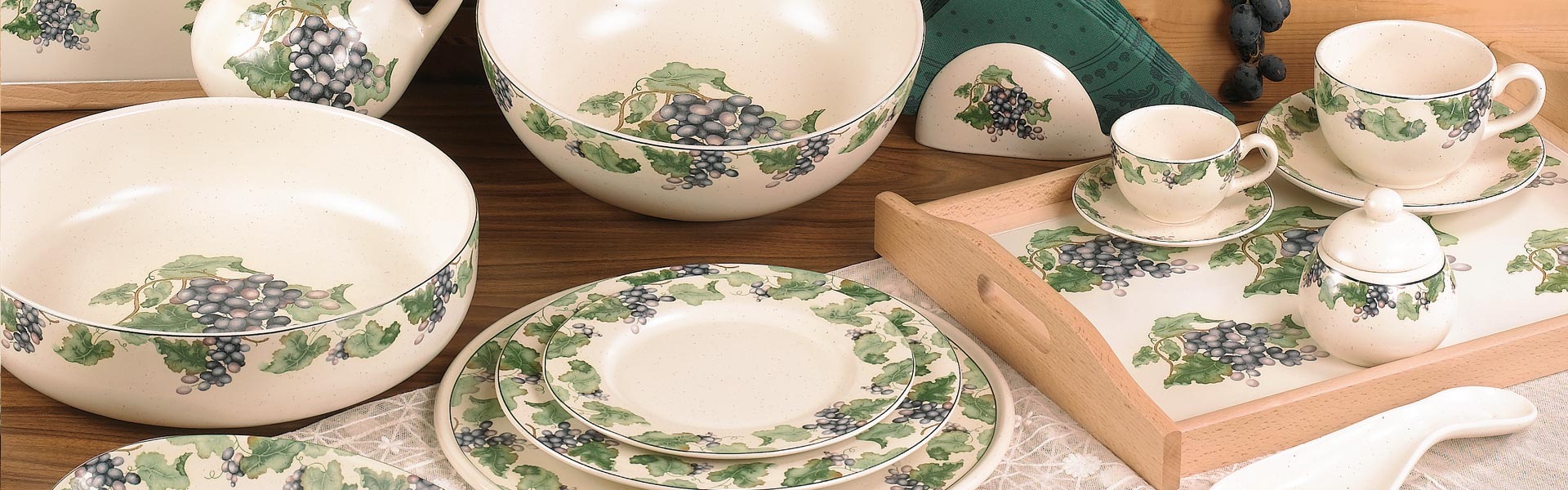 Il tema del'uva è un elemento che si sposa bene con qualsiasi tipo di cucina country e classica, con un gusto caldo tutto italiano.